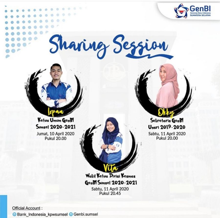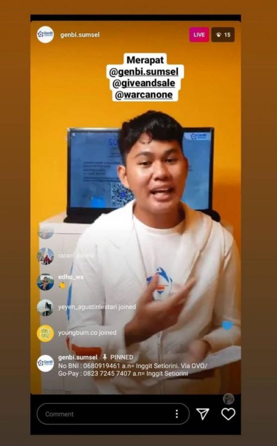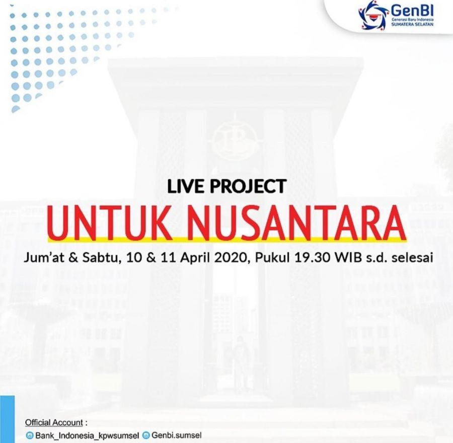 Kegiatan ini dilakukan secara virtual live instagram genbi sumsel, dengan mengemas rangkaian acara bernyanyi, puisi, dan sharing session, uang yang didapatkan akan digunakan untuk membantu keperluan masyarakat yang terkena dampak Covid-19