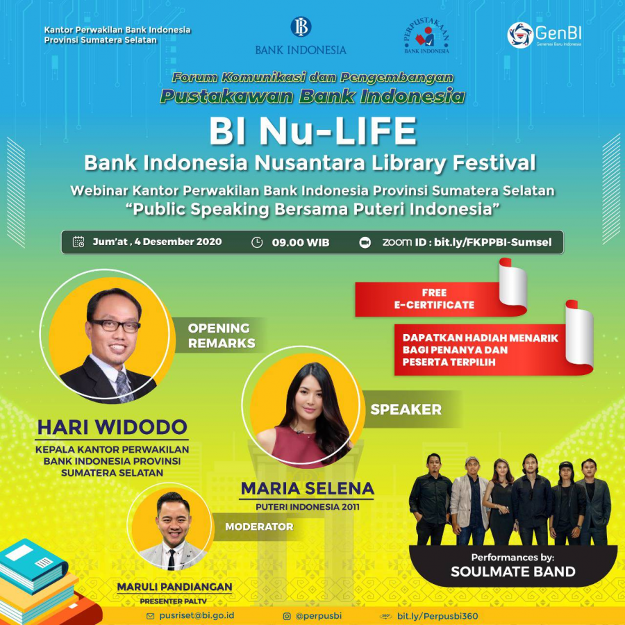 Kegiatan “Webinar Public Speaking” ini merupakan kolaborasi antara Perpustakaan Kantor Pusat dan Perpustakaan KpwBI Provinsi Sumatera Selatan bersama Generasi Baru Indonesia Sumatera Selatan dalam rangka Forum Komunikasi dan Pengembangan Pustakawan Bank Indonesia (FKPPBI) 2020, dengan mengundang pemenang Puteri Indonesia 2011 yang mewakili Indonesia di ajang Miss Universe 2012 di Las Vegas, Amerika Serikat yakni Maria Selena yang saat ini aktif di dunia entertainment sebagai model, presenter, sportcaster dan news anchor.